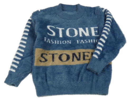Modro-béžovo-biely chlpatý sveter s nápismi