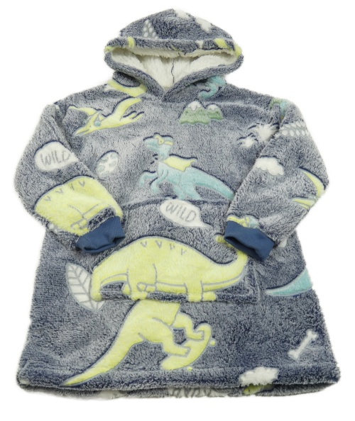 Tmavomodrá melírovaná chlpatá oversize mikina s dinosaurami a kapucí vel.116-128