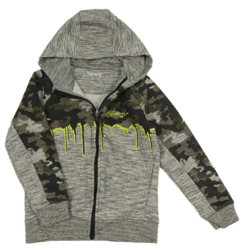 Šedo-černo-army melírovaná prepínaci mikina s nápisom a skvrnkami a kapucňou Nutmeg