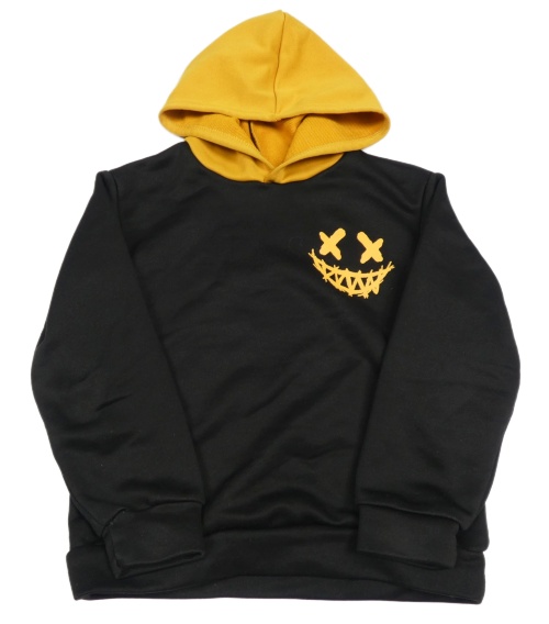 Hořčicovo-čierna mikina so smajlíkom a kapucňou