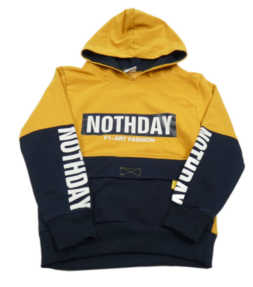 Okrovo-tmavomodrá mikina s nápisom a kapucňou