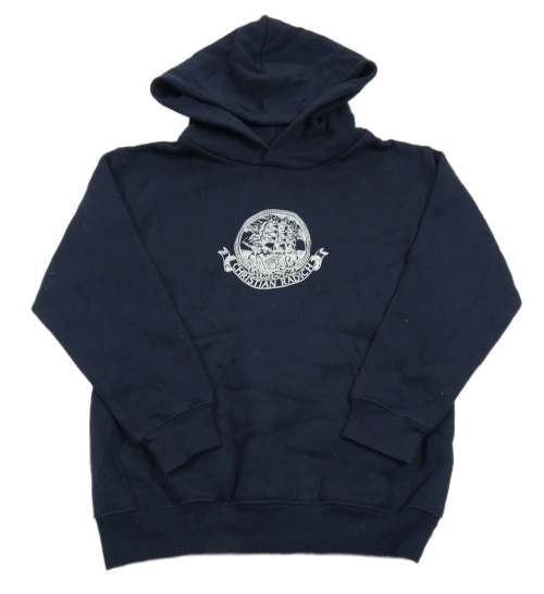 Tmavomodrá mikina s potiskem lodi a kapucňou Fruit of the Loom
