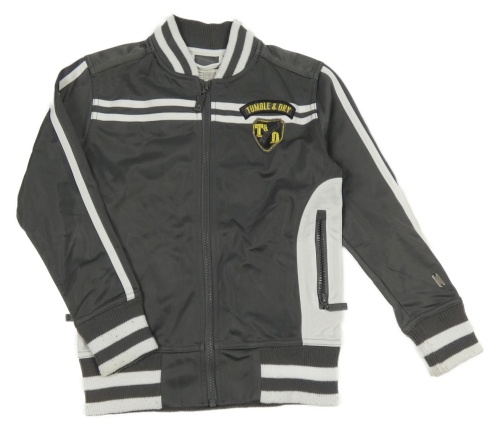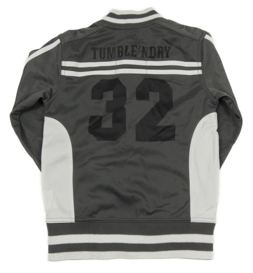 Tmavošedo-biela prepínaci športová mikina s nášivkou a pruhmi a číslom TUMBLE 'N DRY