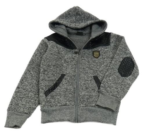 Tmavosivá melírovaná pletená prepínaci mikina s nášivkou a kapucňou