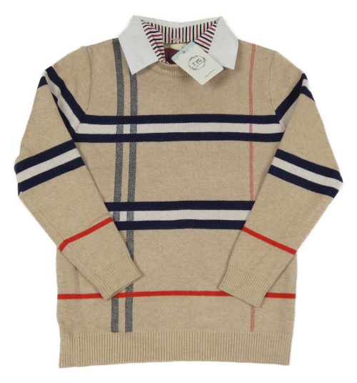 Nové - béžovo-tmavomodro-bielo-červený kockovaný melírovaný sveter s golierikom