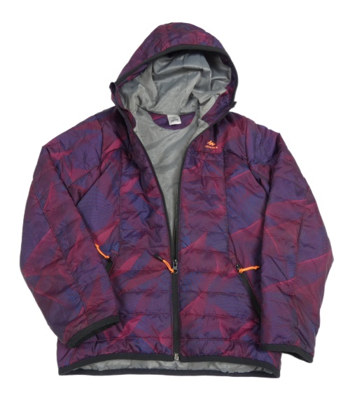 Tmavomodro-vínová vzorovaná šušťáková funkčná zateplená bunda s kapucňou Quechua