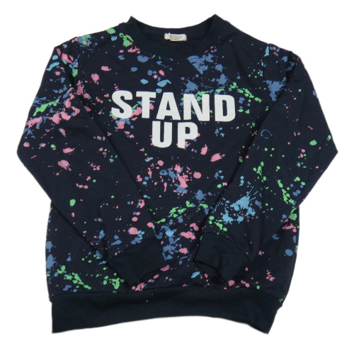 Tmavomodrá mikina s fľakmi a nápisom