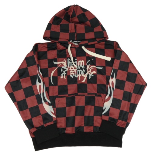 Vínovo-čierna kockovaná mikina s nápisom a kapucňou