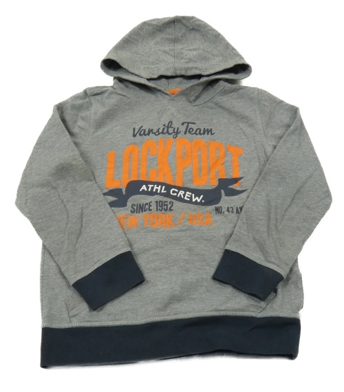 Sivo-tmavomodrá mikina s nápisom a kapucňou