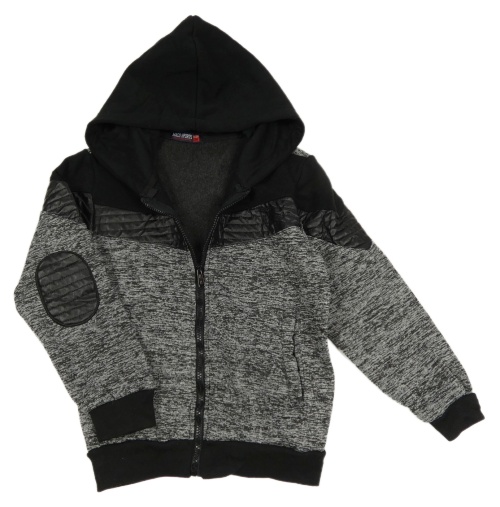 Čierno-sivá melírovaná prepínaci mikina s koženkovou vsadkou a kapucňou