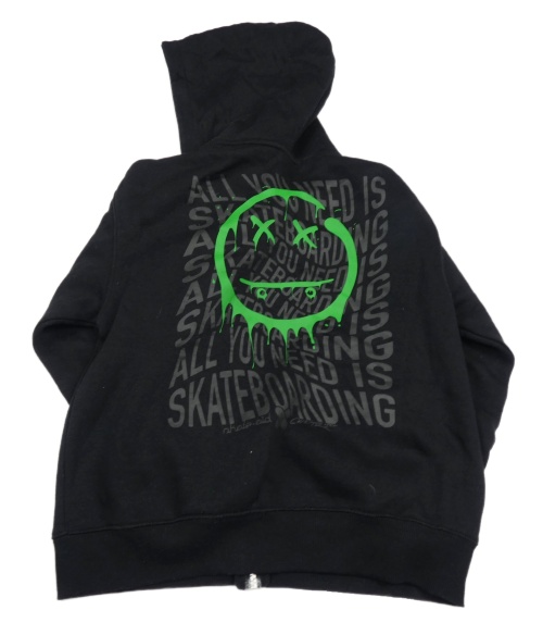 Čierna prepínaci tepláková mikina s nápismi a skateboardom a smajlíkom a kapucňou