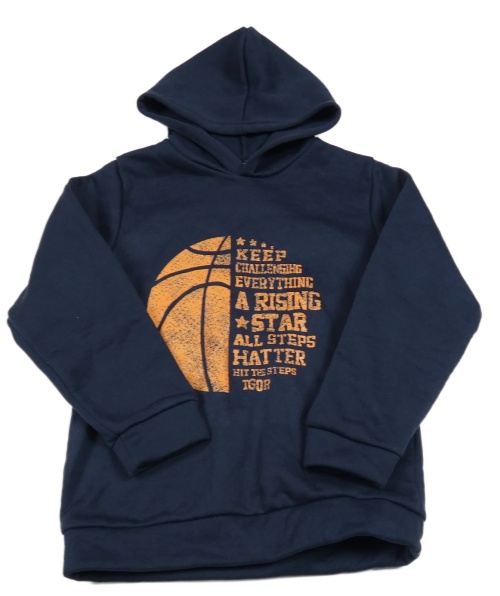 Tmavomodrá mikina s loptou a nápismi a kapucňou