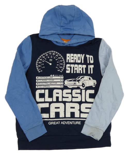Tmavomodro-modro-svetlomodrá mikina s nápismi a autom a kapucňou Kids