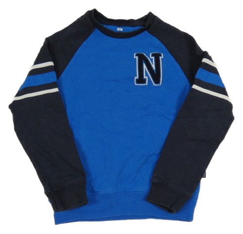 Modro-tmavomodrá mikina s písmenkom a vzorom a pruhmi we