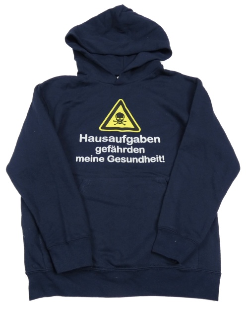 Tmavomodrá mikina s nápisem, lebkou a kapucňou