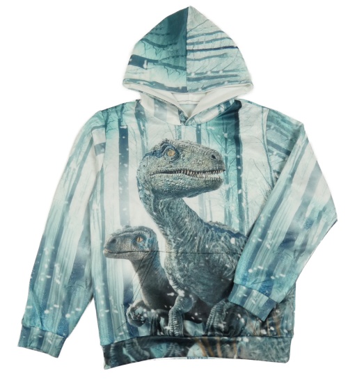 Olivovošedo-biela mikina s dinosaurami a vreckom a kapucňou