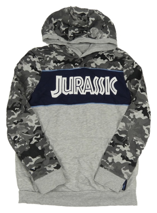 Šedo-tmavomodro-army melírovaná mikina s dinosaury - Jurský svět a vreckom a kapucňou C&A