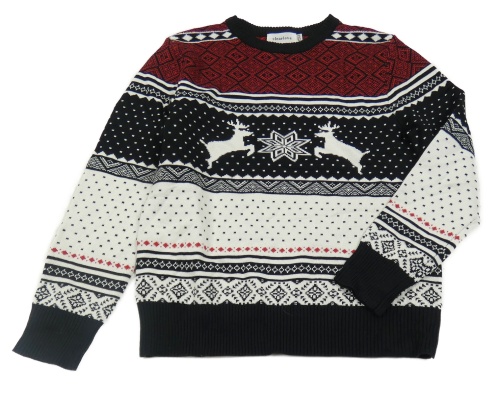 Čierno-bielo-červený vzorovaný sveter s jeleňmi