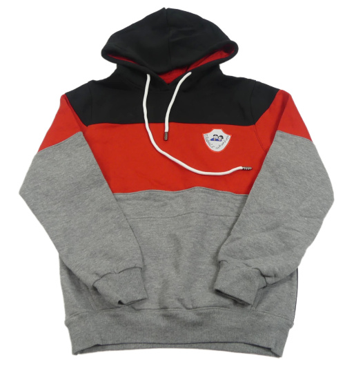 Čierno-červeno-sivá mikina s nášivkou a kapucňou