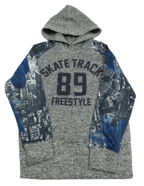 Sivo-čierno-biela melírovaná pletená mikina s číslom a nápisy a sportovními rukávy s městem a kapucňou YIGGA