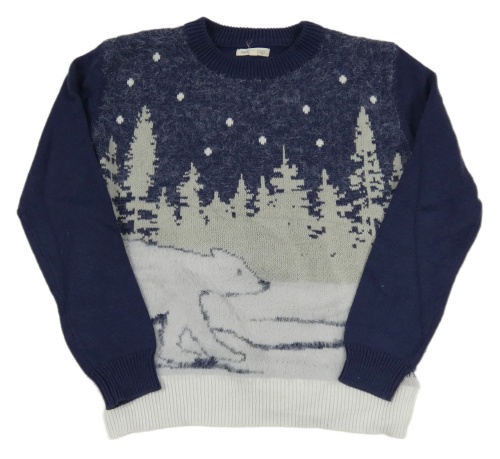 Tmavomodro-sivo-svetlošedá -biely sveter s medvedíkom a stromčekmi ANGEL&ROCKET