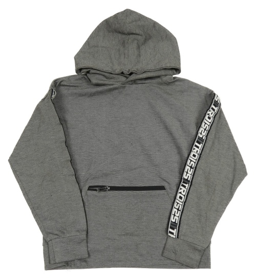 Tmavosivá pruhovaná mikina s pruhem na rukávech s nápismi a kapucňou