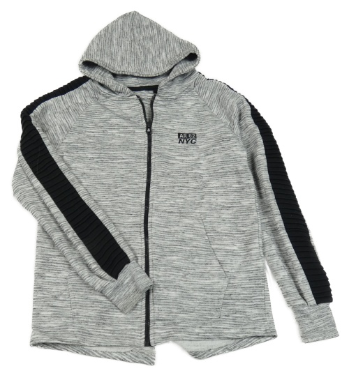 Šedo-černá melírovaná propínací mikkina s nápisom a kapucňou