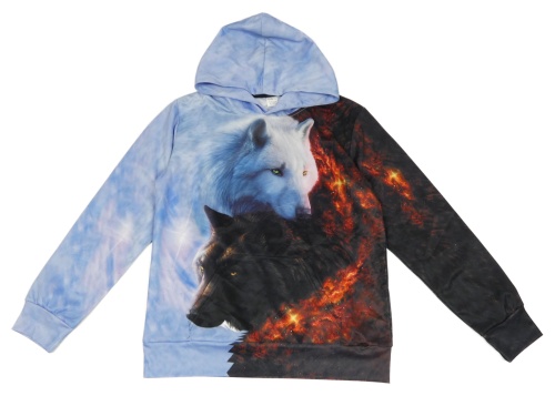 Světlemodro-čierno-červená mikina s vlky a kapucňou