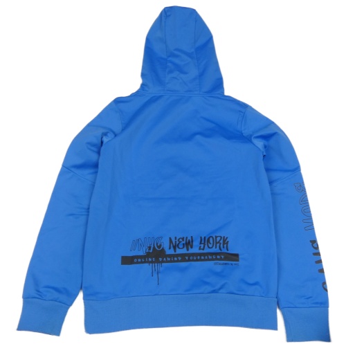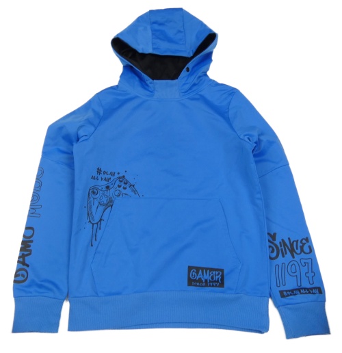 Modrá športová mikina s nápismi a ovladačem a kapucňou