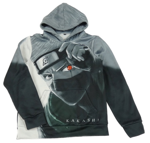 Čierno-sivo-biela tepláková mikina s potiskem - KAKASHI a vreckom a kapucňou