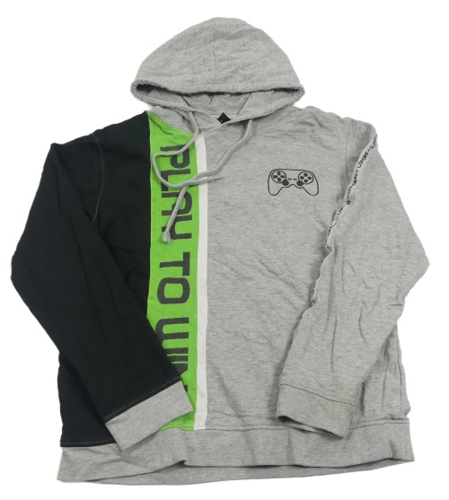 Sivo-čierno-zelená mikina s nápisom a ovladačem a kapucňou
