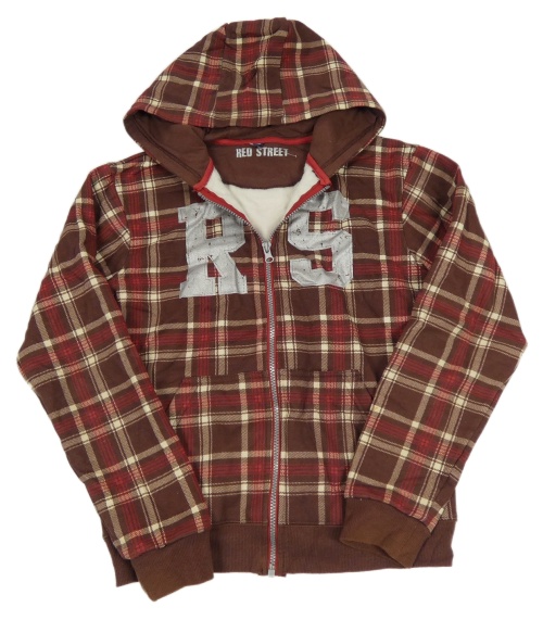Hnedo-červeno-smotanová kockovaná zateplená prepínaci mikina s číslom a kapucňou