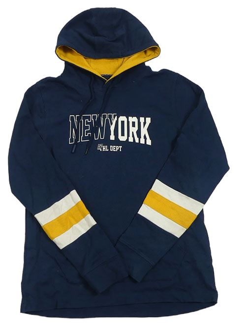 Tmavomodro-bílé žebrované mikinotriko s nápisom a pruhom a vreckom a kapucňou