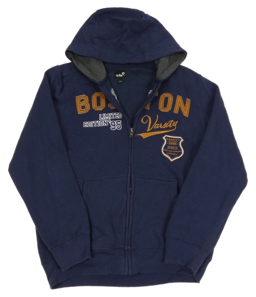 Tmavomodrá prepínaci mikina s nápisom a kapucňou