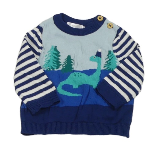 Tmavomodro-modro-biely sveter s dinosaurom a pruhy na rukávech M&Co.