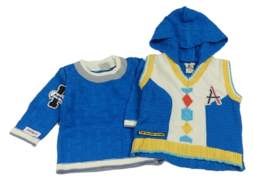 2set- azurovo-sivý sveter s nášivkou+ béžovo-modrá pletená vesta s písmenem a kapucňou