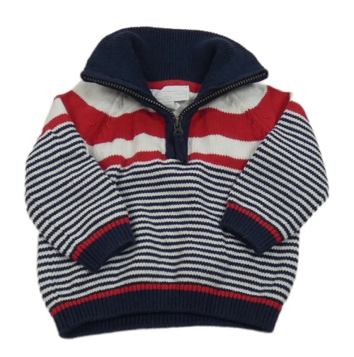 Tmavomodro-bielo-červený pruhovaný sveter so stojačikom