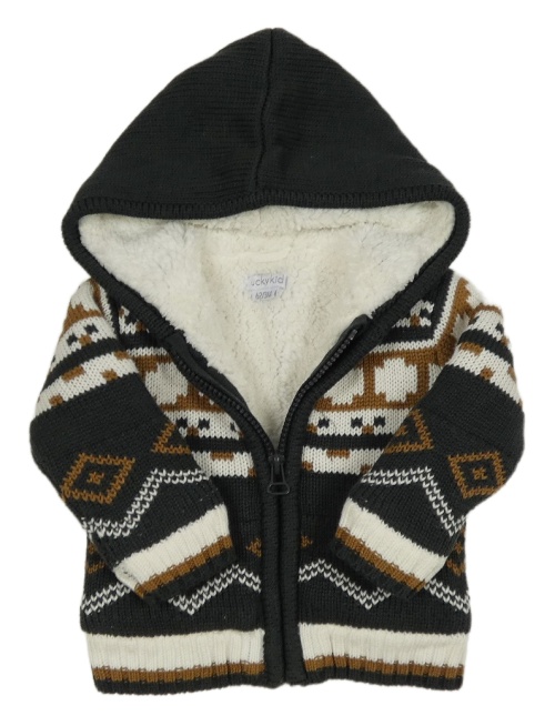 Tmavokhaki-bielo-hnedý vzorovaný prepínaci zateplený sveter s kapucňou