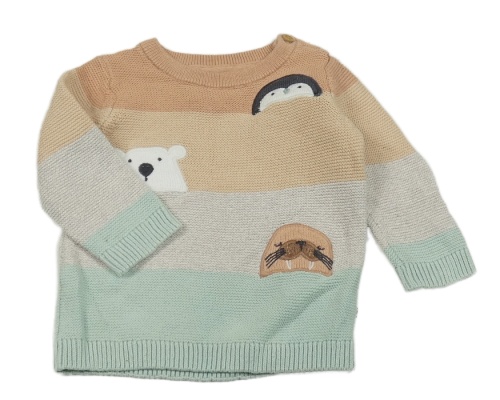 Světlezeleno-sivo-oranžový pruhovaný sveter so zvieratkami F&F