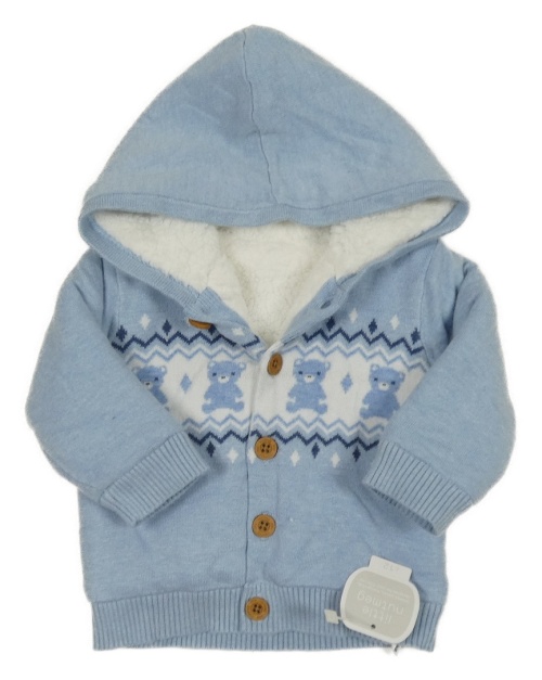 Nové - modro-biely prepínaci zateplený sveter s medvedíkmi a vzorom a kapucňou little nutmeg