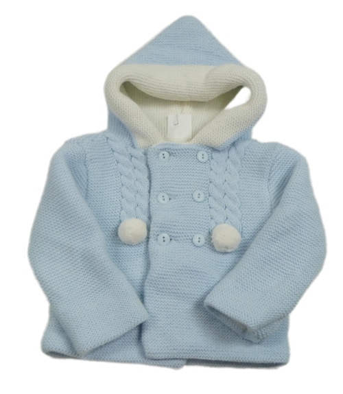 Svetlomodrý prepínaci sveter s bambulemi a kapucňou