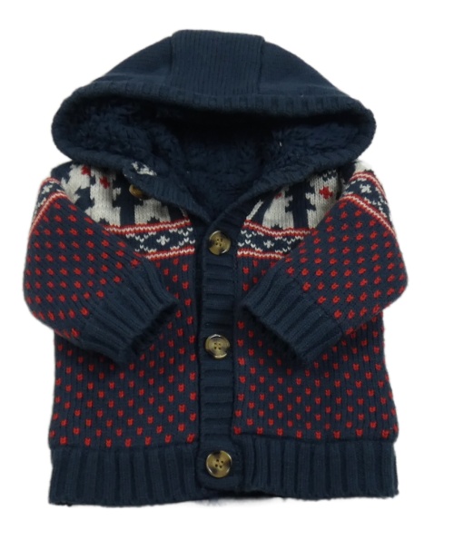 Tmavomodro-sivo-červený vzorovaný zateplený prepínaci sveter s kapucňou George