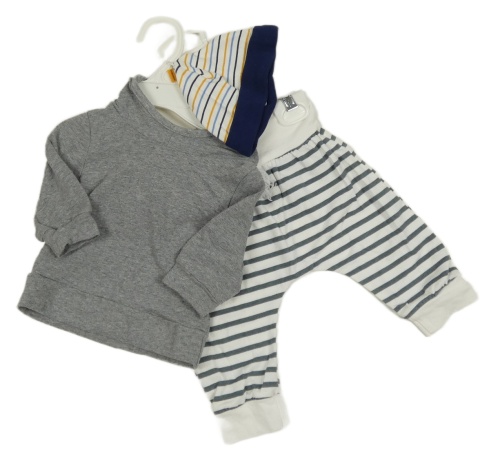 Nové - 3set - Sivá melírovaná mikina + bielo-tmavosivé pruhované tepláky + bielo-farebná pruhovaná bavlnená čapica