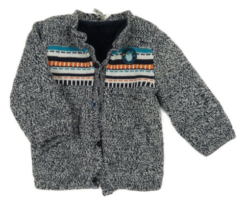 Tmavomodro-bielo-farebný melírovaný prepínaci zateplený sveter s nášivkou