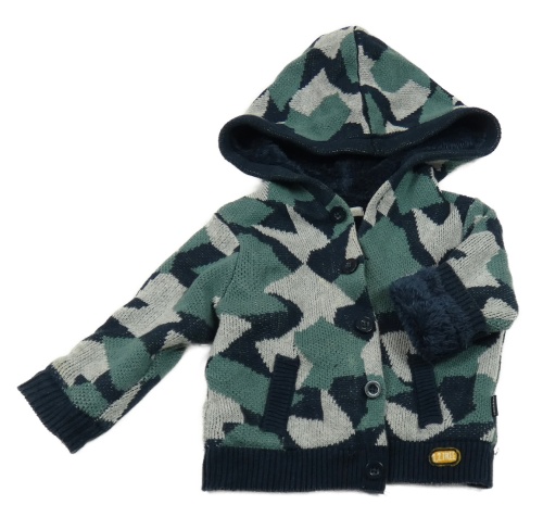 Tmavomodro-zeleno-sivý vzorovaný zateplený prepínaci sveter s kapucňou