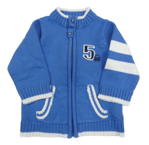 Modro-biely prepínaci sveter s číslom a autom a pruhmi