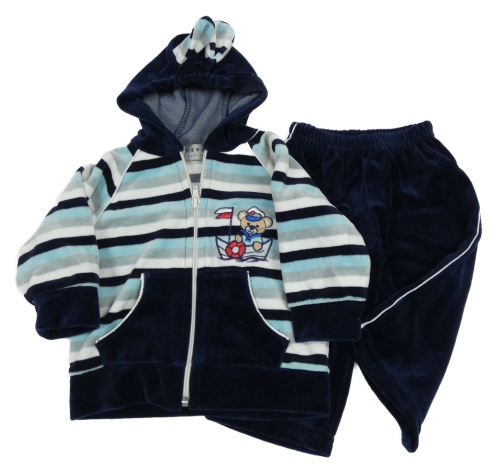 2set - Modro-bielo-tmavomodrá pruhovaná zamatová prepínaci mikina s medvedíkom a kapucí + tepláky