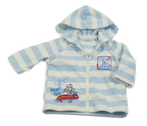 Světlemodro-biela pruhovaná prepínaci mikina so psem a kapucňou