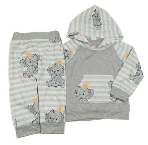 2 set - sivá ľahká mikina s pruhovanymi rukávy a slonmi a kapucí + pruhované tepláky