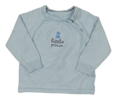 Svetlomodrý melírovaný prepínaci úpletový sveter s medvedíkom a nápismi little nutmeg